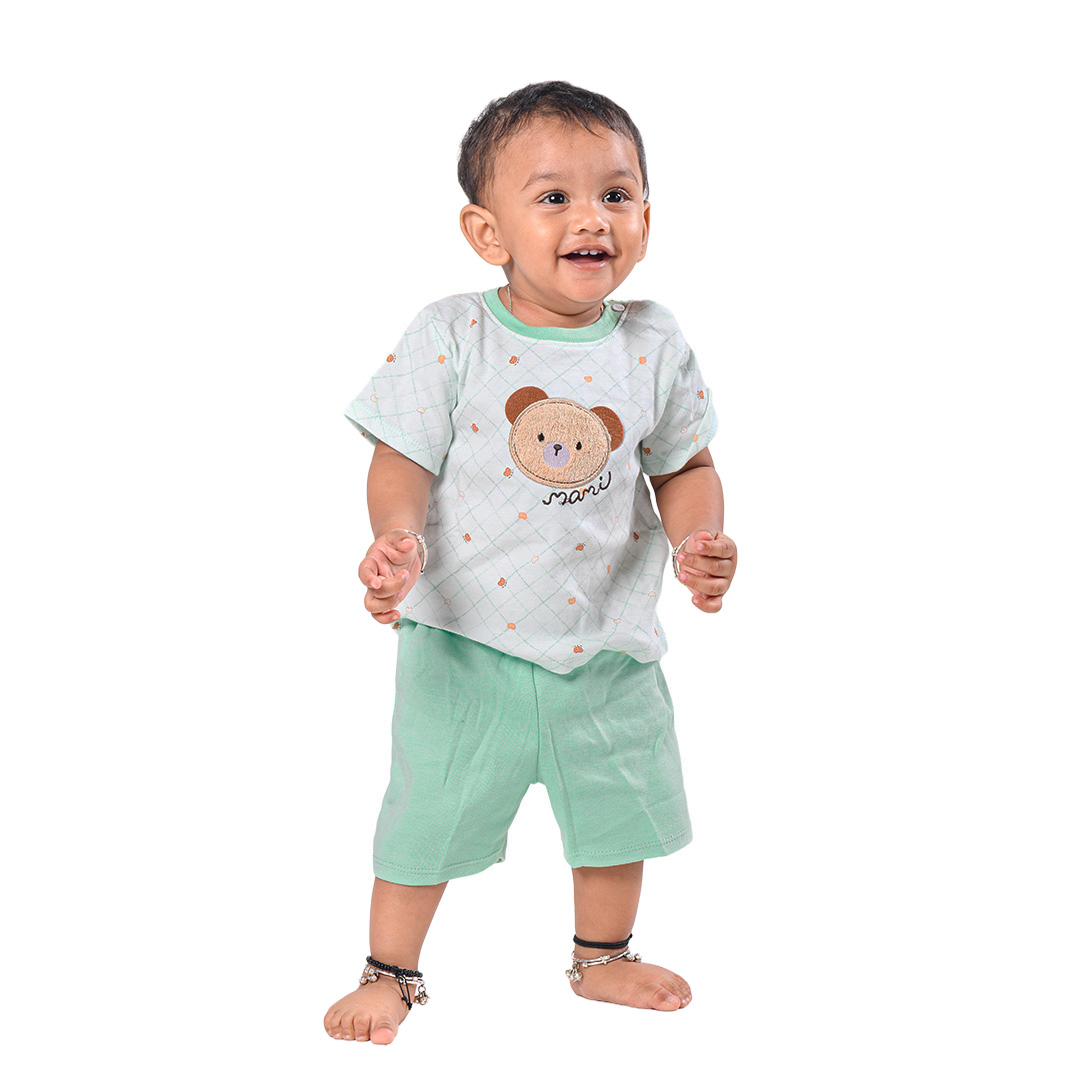 Featuring an adorable embossed koala embroidery on pastel check prints, paired with soft matching shorts — stylish and super gentle on baby skin.