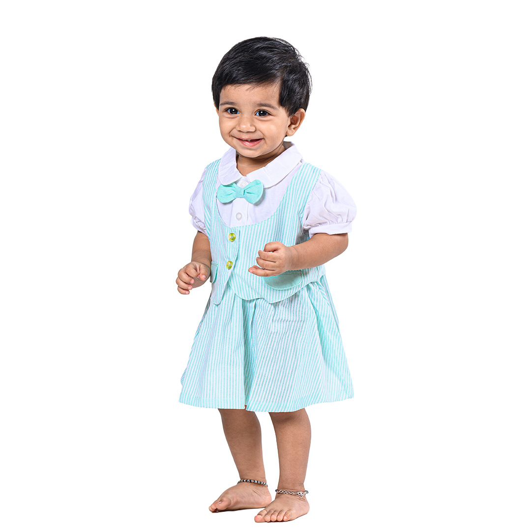 Soft Cotton Dress with Attached Vest & Bow Design - Blue Original price was: ₹899.00.Current price is: ₹850.00.