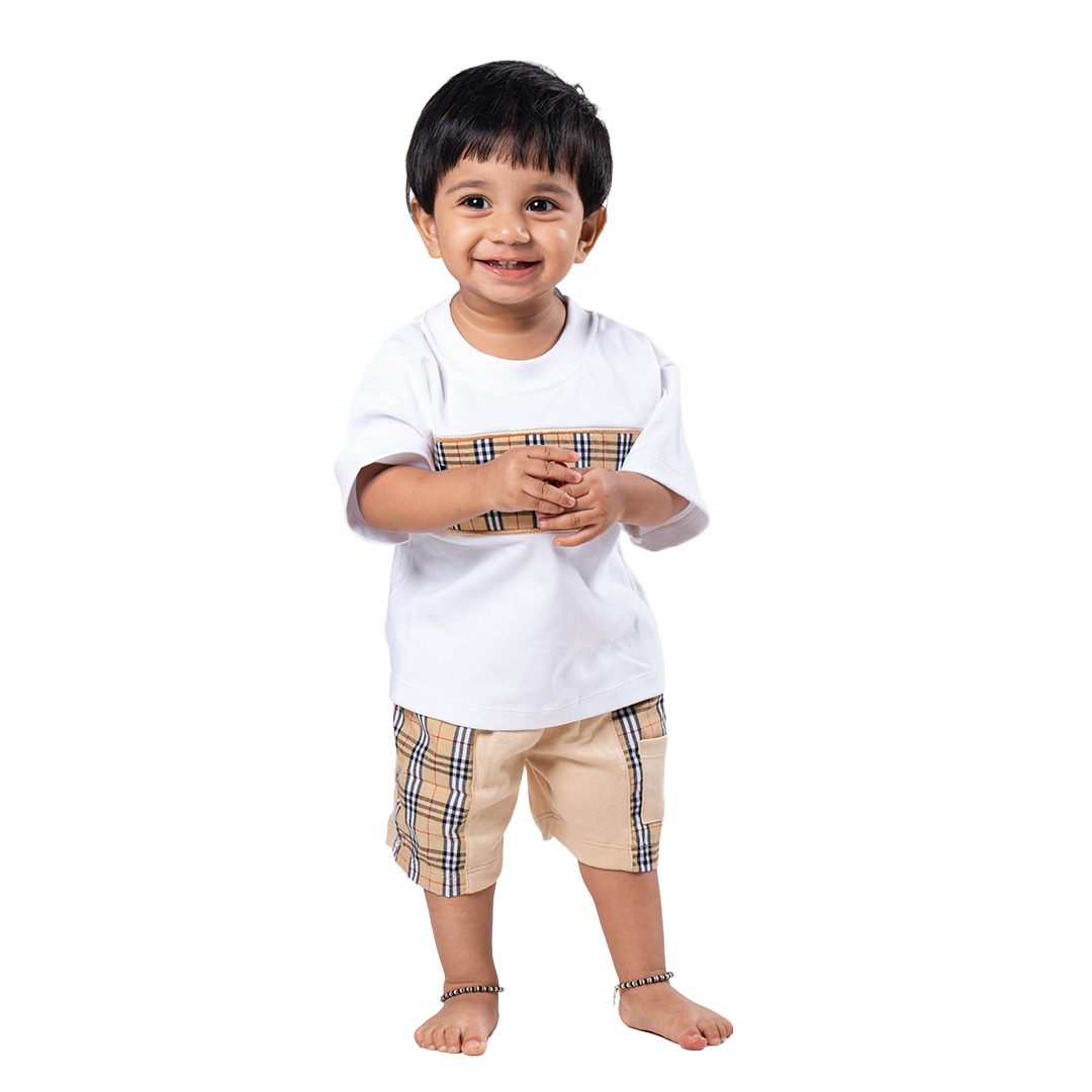 Trendy Boys Cotton T-Shirt + Plaid Panel Shorts Outfit