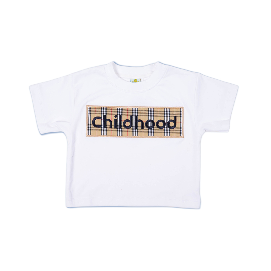 ✔ A white cotton T-shirt with a plaid patch & Childhood text